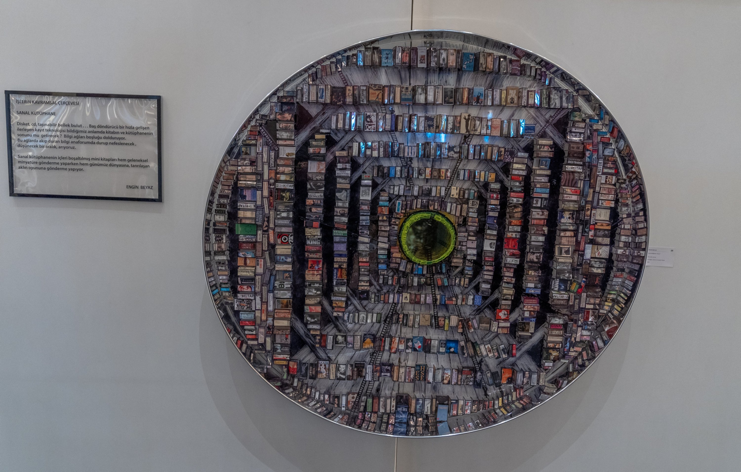 In an interview with Anadolu Agency (AA) Beyaz explained that he worked in his studio in Istanbul and came to Ankara specifically for this exhibition. He emphasized that his artwork references the virtual world and virtual books, noting that while some of the books in his pieces truly exist, others are products of his own imagination.