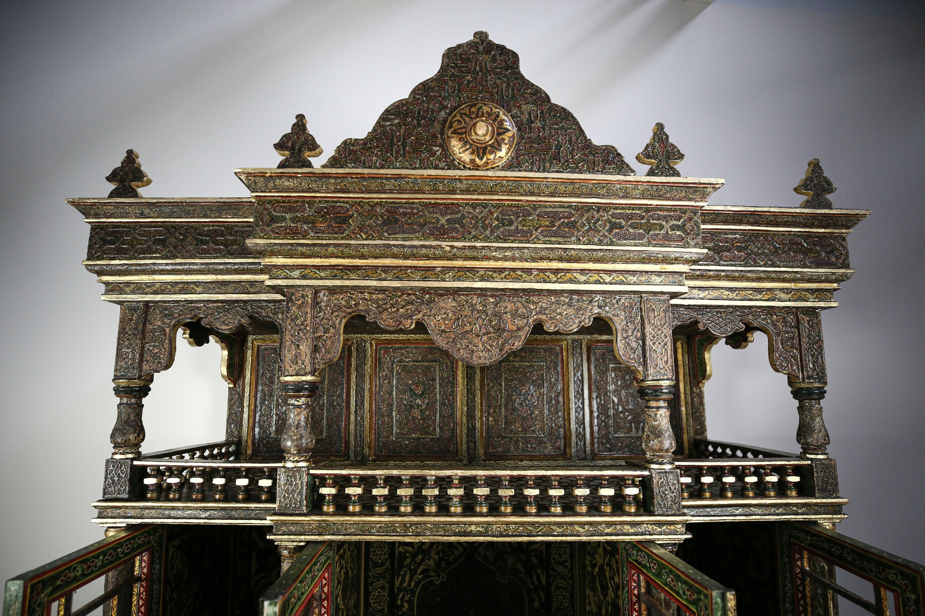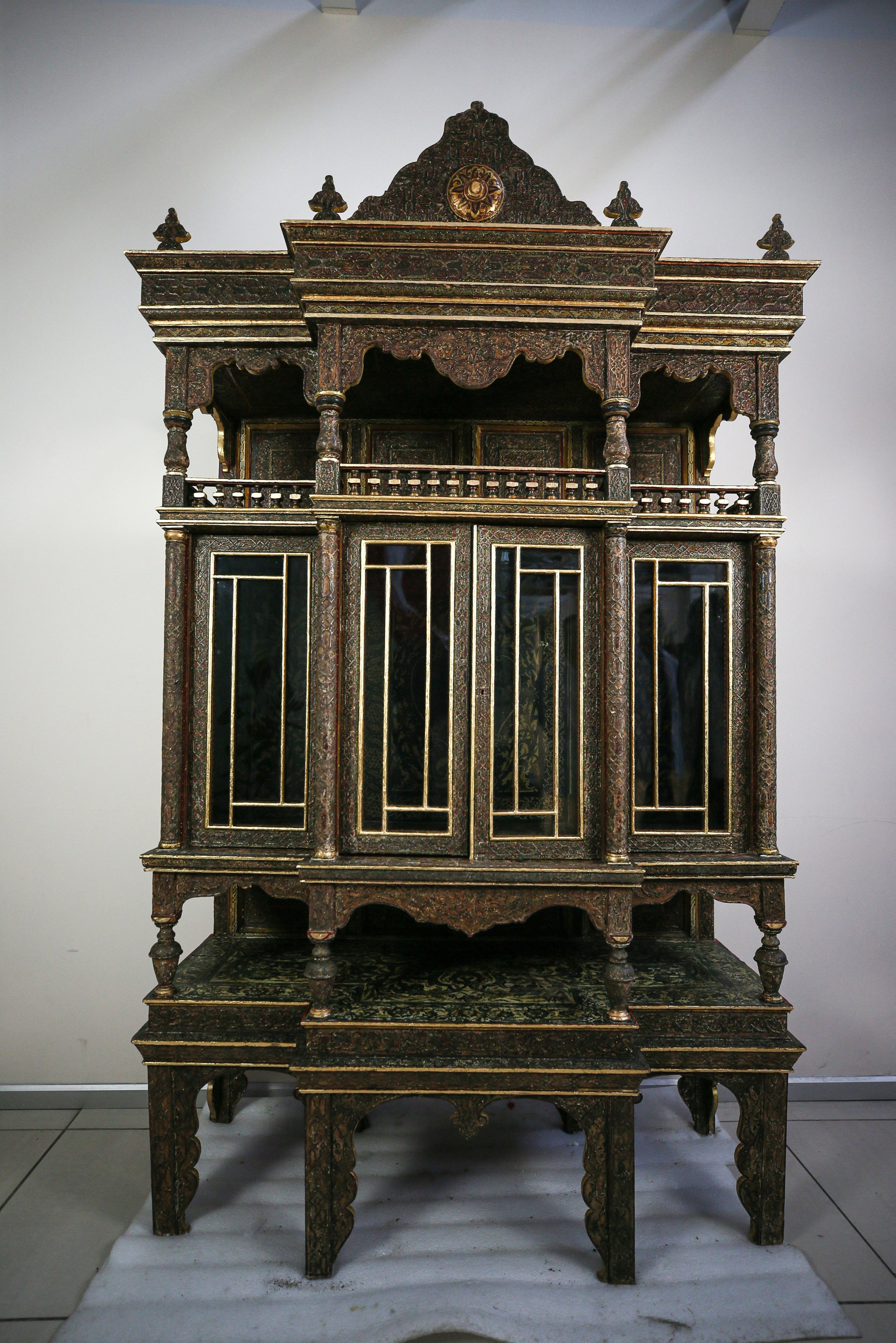 About 2 meters tall, the cabinet was described in the exhibition catalog as “an ornate glass cabinet, 2 meters in height, made in an Arab style.”