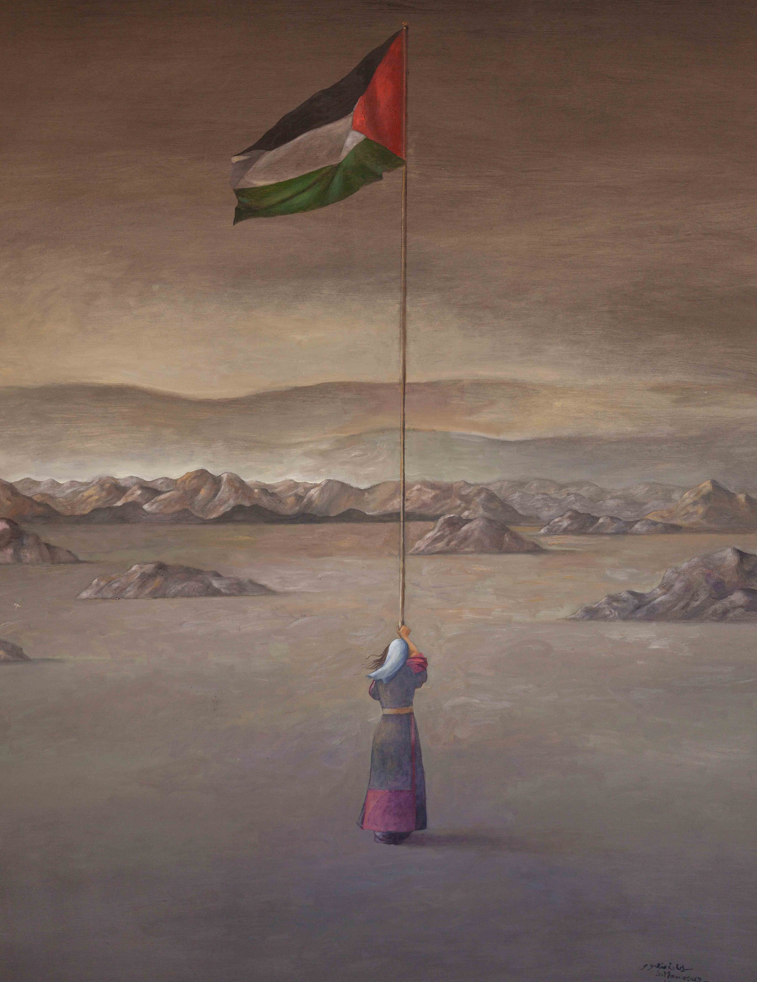 "The Palestine Is My Homeland" section features the work of Nabil Anani, one of the founding figures of contemporary Palestinian art. His paintings blend traditional motifs and materials with modern techniques, incorporating village landscapes and maternal figures rendered in natural pigments. The result is a visual expression of both enduring loss and enduring hope.