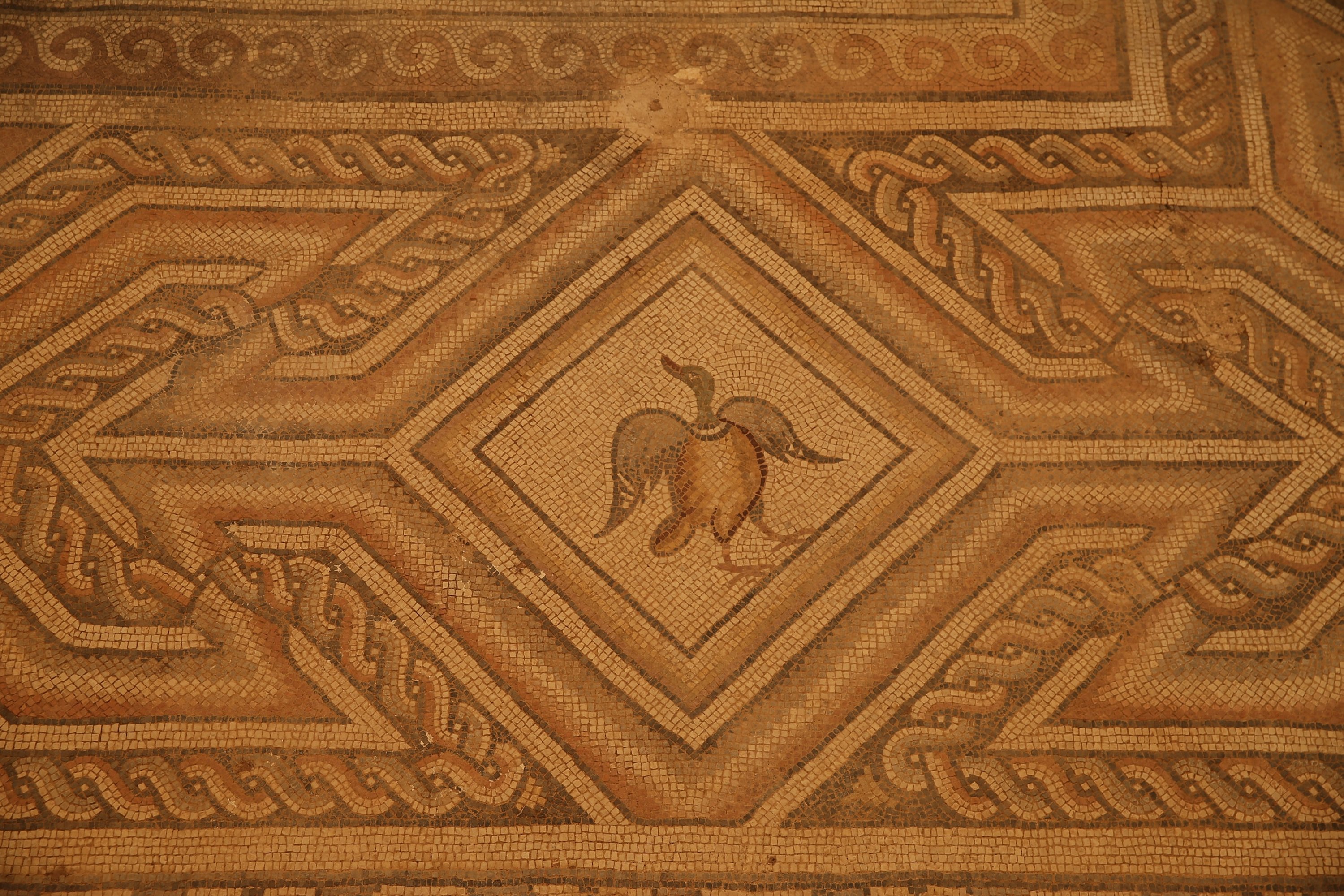 Discovered during archaeological excavations in 2009 and identified as part of a basilica structure, the mosaic is notable for both its size and artistic complexity. It remains preserved as a single piece and features detailed three-dimensional cube motifs, octagonal and heart-shaped patterns and natural depictions of grapevines, grape clusters, deer, roosters, hens and demoiselle cranes.