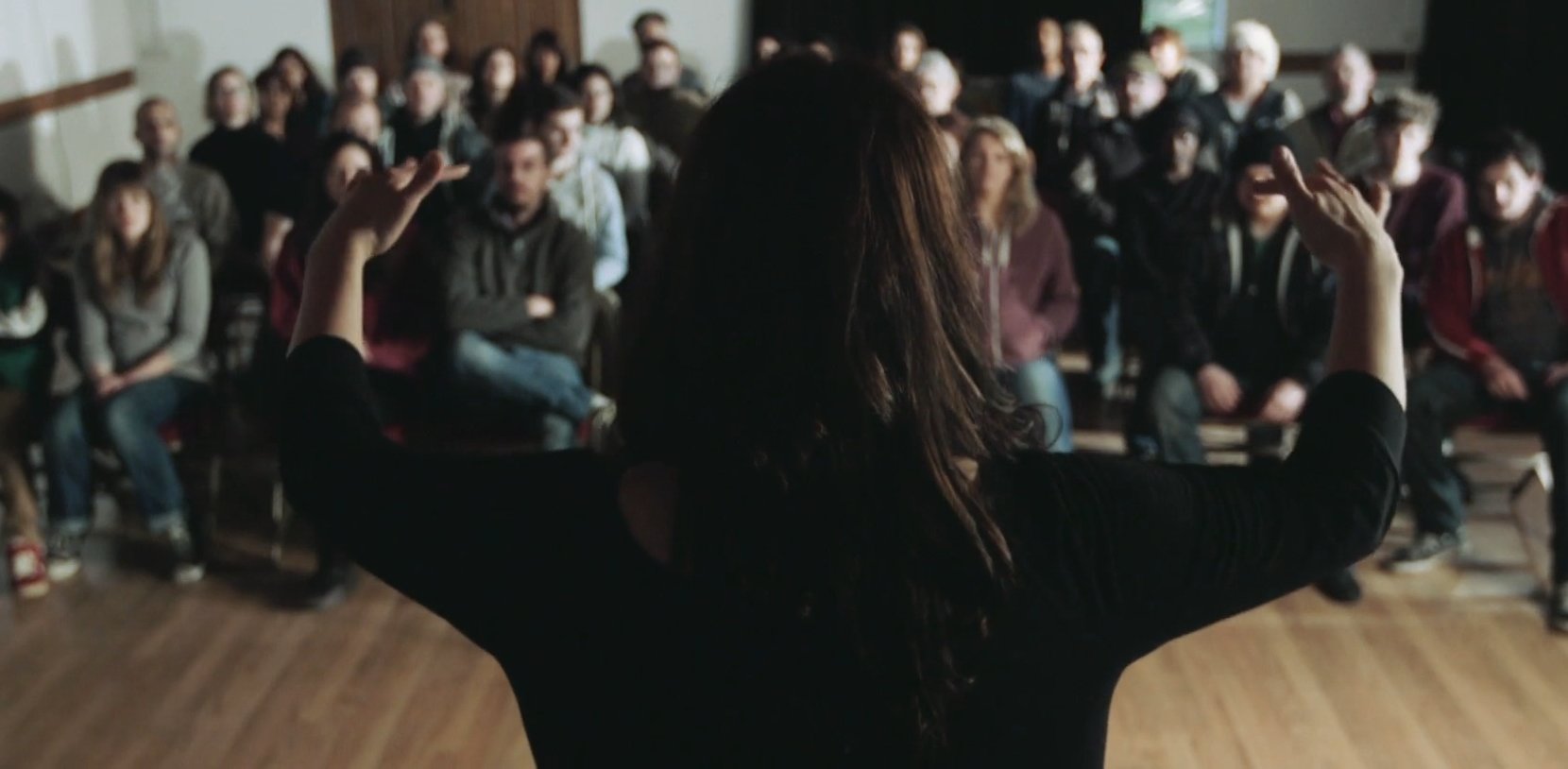 The members focus, instead, on running the house, cultivating the garden, breathing exercises and hyping Eva about the "experience" she’ll go through with Mia, engineered to sever all her (emotional) ties with the hearing world. Evans shows us, incrementally, how the discourse of hearing-non-hearing antagonism takes center stage in the community’s conversation. Eva finds this strange, and finally, when they do a "raid drill" with everyone having to go into a basement, she understands that this community takes the hearing-non-hearing divide very seriously.