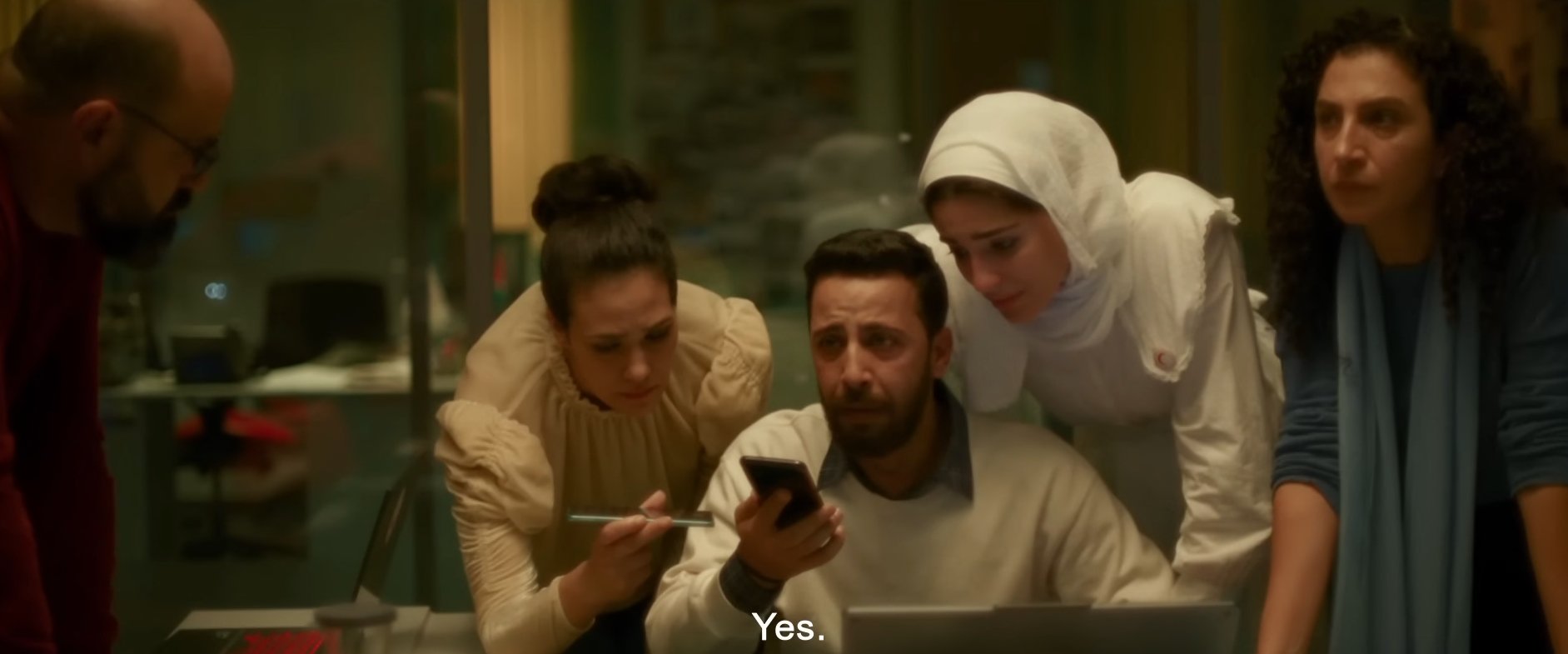 I can’t quite recall now how early in the film Ben Hania does this but she starts overlaying the staff’s real voices with the actors’ faces. That is, we see the actor’s face, but a sign appears on the film screen citing a voice file number. Ben Hania takes this even a step further and sometimes overlaps the voice of the real staff with the voice of the actor. At one point, we hear the aid worker Rana say a sentence and the actress playing her, Saja Kilani, repeat it in her own voice. The almost organic bond between the actors and the health workers are felt in the press briefing, as they are all sitting on the platform together. When asked how it felt to be portraying these heroes, the actors unanimously say that it was the greatest honour of their lives.