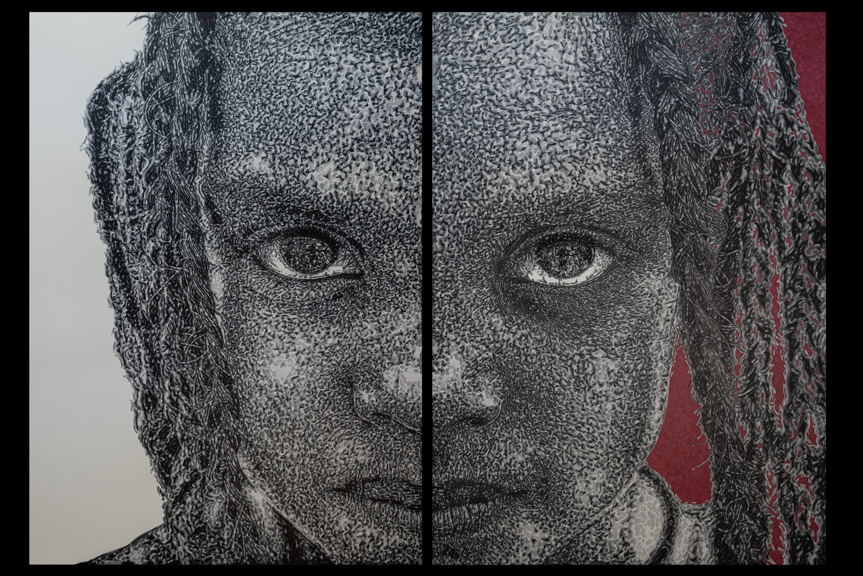 Some works employ extreme close-ups, focusing tightly on faces that return the viewer’s gaze with a fixed intensity. In these moments, the artist functions almost as a documentarian, but one who cedes control to his subjects.