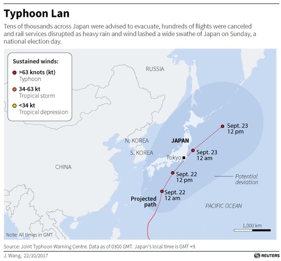 Typhoon Lan, classified as an intense Category 4 storm by the Tropical Storm Risk monitoring site, was south of Japan and moving northeast at 40 kph on Sunday afternoon, the Japan Meteorological Agency (JMA) said.