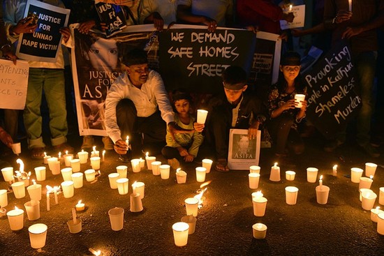 Rights activist stage a candle light vigil in solidarity with the recent rape cases in Uttar Pradesh and Jammu and Kashmir states and to demand swift justice and severe punishment to the accused, in Bangalore on April 16, 2018. (AFP Photo)