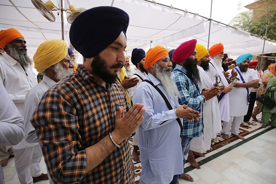 Sikh men stand with folded hands during a special prayer session held by the Shiromani Akali Dal (Amritsar) and Damdami Taksal, for Asifa Bano, at Akaal Takhat, the highest temporal seat for the Sikhs at the Golden Temple in Amritsar, India, 16 April 2018. (EPA Photo)