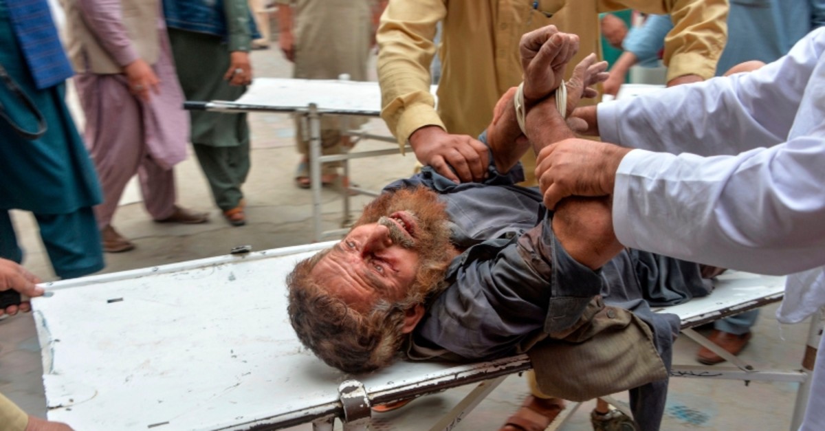 Volunteers carry an injured man on a stretcher to a hospital, following a bomb blast in Haska Mina district of Nangarhar Province on October 18, 2019. (AFP Photo)