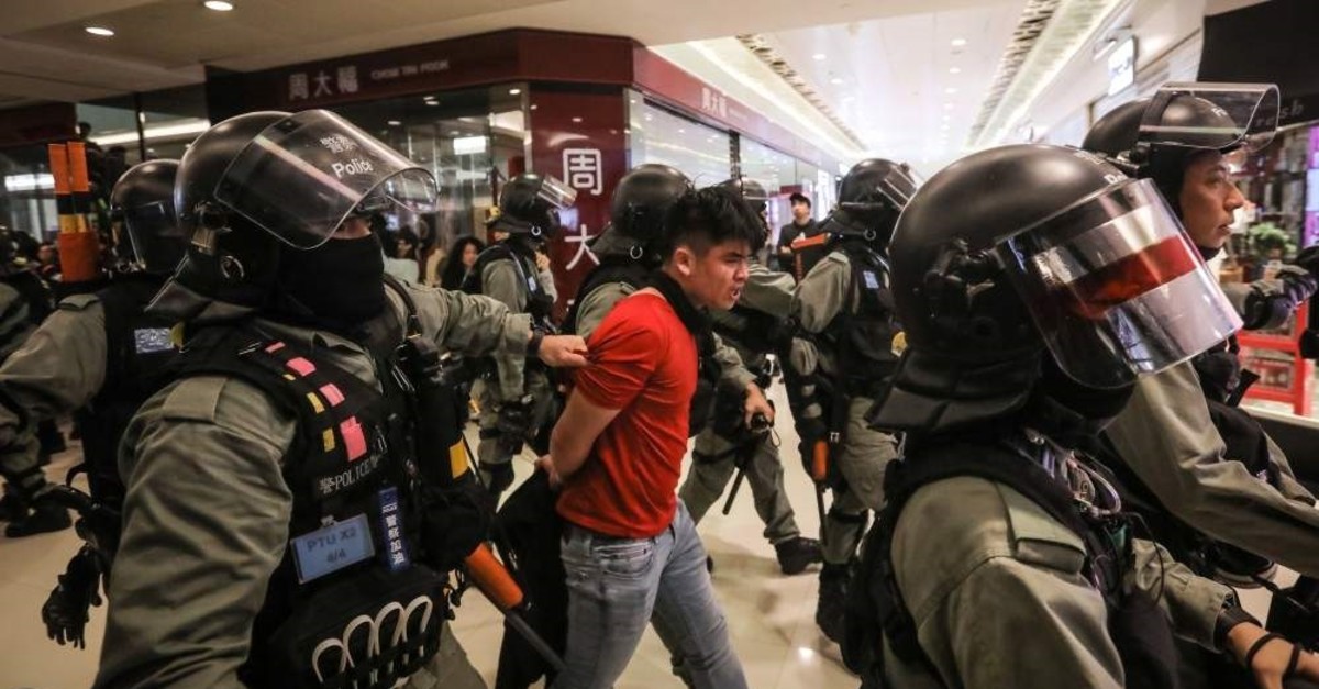 Saturday afternoon, masked plain-clothed officers wielding batons arrested 15 people, including a 14-year-old girl, who were protesting inside the mall in the Sheung Shui district, forcing shops to shut down as harassment toward shoppers occurred, an AFP reporter at the scene said.