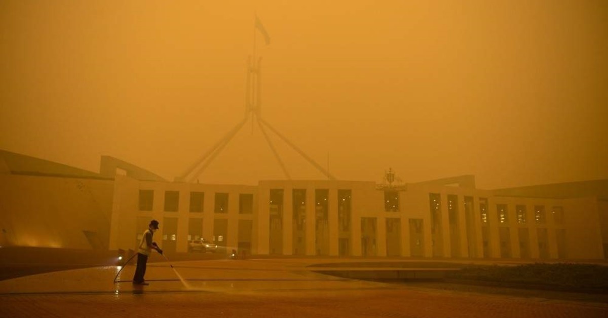 A man cleans the forecourt of Parliament House surrounded by smoke haze early morning in Canberra, Sunday, Jan. 5, 2020. (AP Photo)