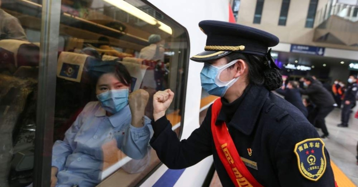 Train attendant gestures to medical staff leaving for Wuhan in Nanchang, central Jiangxi province, China. (STR via AFP)
