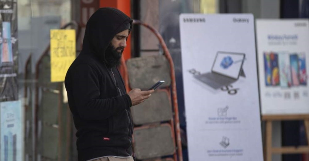 A Kashmiri man browses the internet on his mobile phone outside a shop, Srinagar, Jan. 30, 2020. (AP Photo)