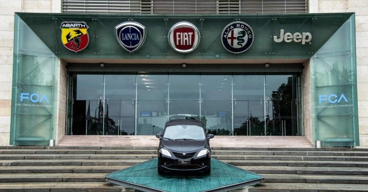 In this file photo taken on May 27, 2019, the logos of automobile companies (L-R) Abarth, Lancia, Fiat, Alfa Romeo and Jeep are pictured at the entrance to the Fiat Chrysler Automobiles (FCA) at the Fiat Mirafiori car plant in Turin, Italy. (AFP Photo)