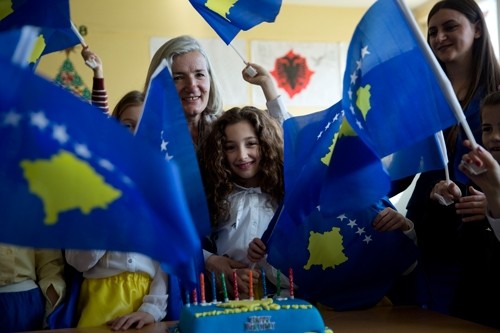 The 4th-grade students celebrated Friday in Sllovi, 17 kilometers (11 miles) south of the capital, Pristina with a concert and other festivities. On the blue-yellow-and-white birthday cake the colors of Kosovo's flag they wrote: "Pavaresia 10 vjet! Happy Birthday!"