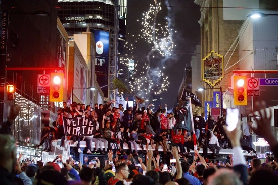 Fans set off fireworks as confetti rained down, creating a carnival-type atmosphere on the streets of Canada's biggest city. The landmark CN Tower was bathed in gold light as cheering people walked by.