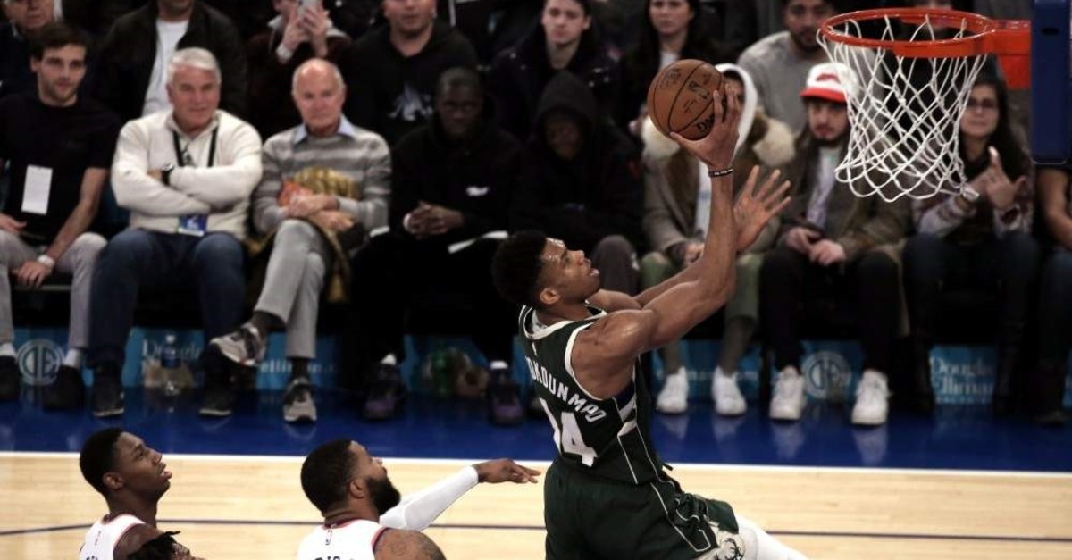 Bucks forward Giannis shoots over three Knicks defenders in the first half in New York, Dec. 21, 2019. (EPA Photo)