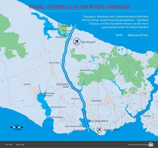 Arslan said at a press conference at the ministry in Ankara that the Küçükçekmece-Sazlıdere-Durusu corridor, the fourth alternative for the project, was chosen as the most convenient route. He added that the 45-kilometer route will enter Küçükçekmece Lake and reach the Black Sea through the Sazlıdere Dam from east of the Terkos Lake.