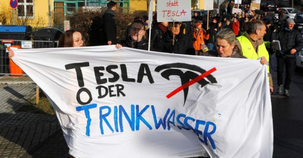Demonstrators hold anti-Tesla posters during a protest against plans by U.S. electric vehicle pioneer Tesla to build its first European factory and design center in Gruenheide near Berlin, Germany January 18, 2020. (Reuters Photo)