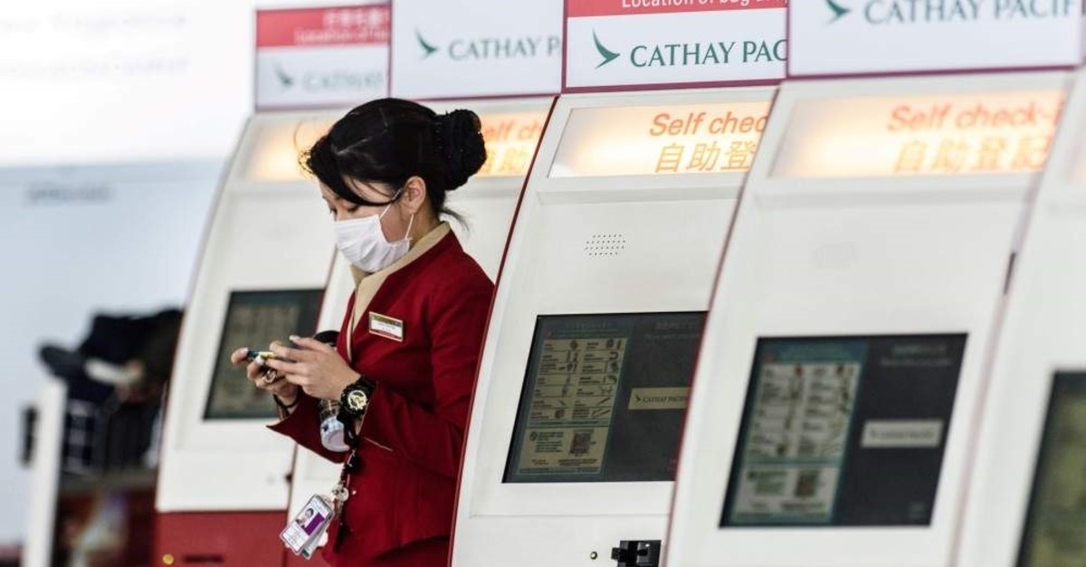 In this file photo, a mask-clad Cathay Pacific employee walks past a row of self check-in counters at the international airport in Hong Kong, March 15, 2017. (AFP Photo)