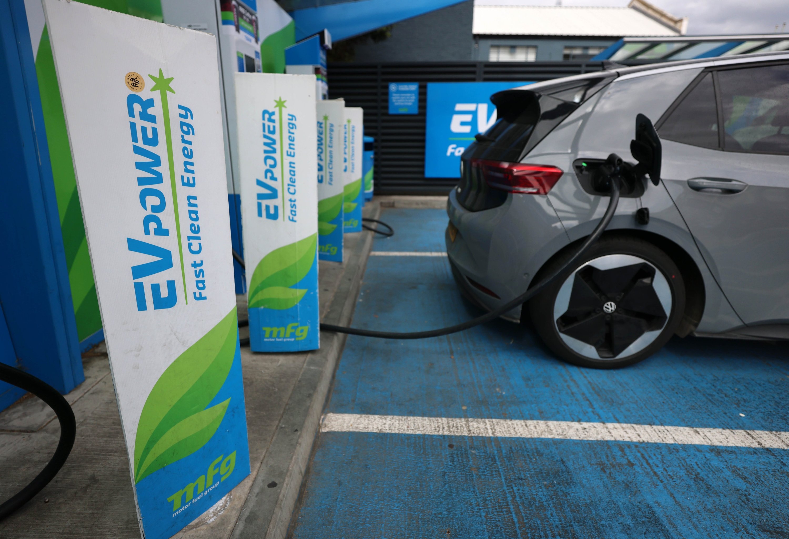 An electric vehicle charges at a station in London, U.K., April 13, 2026. (EPA Photo)
