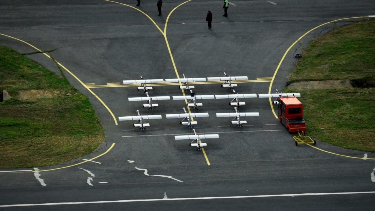 In the final stage, a mixed swarm of 18 unmanned aerial vehicles regrouped into a V formation.