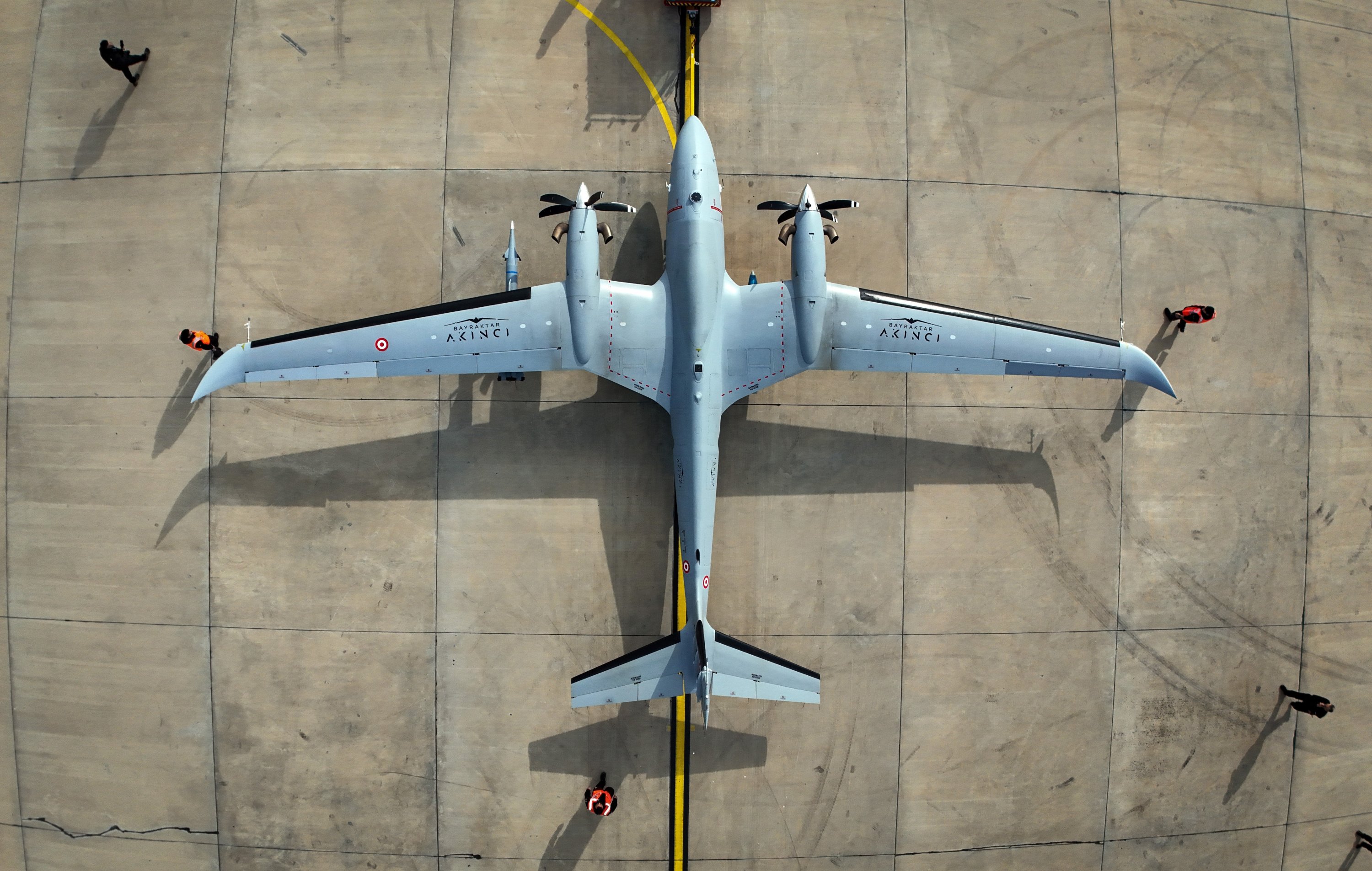 An aerial view of Akıncı unmanned combat aerial vehicle (UCAV) produced by Turkish defense giant Baykar, Tekirdağ, northwestern Türkiye, Jan. 5, 2026. (IHA Photo)