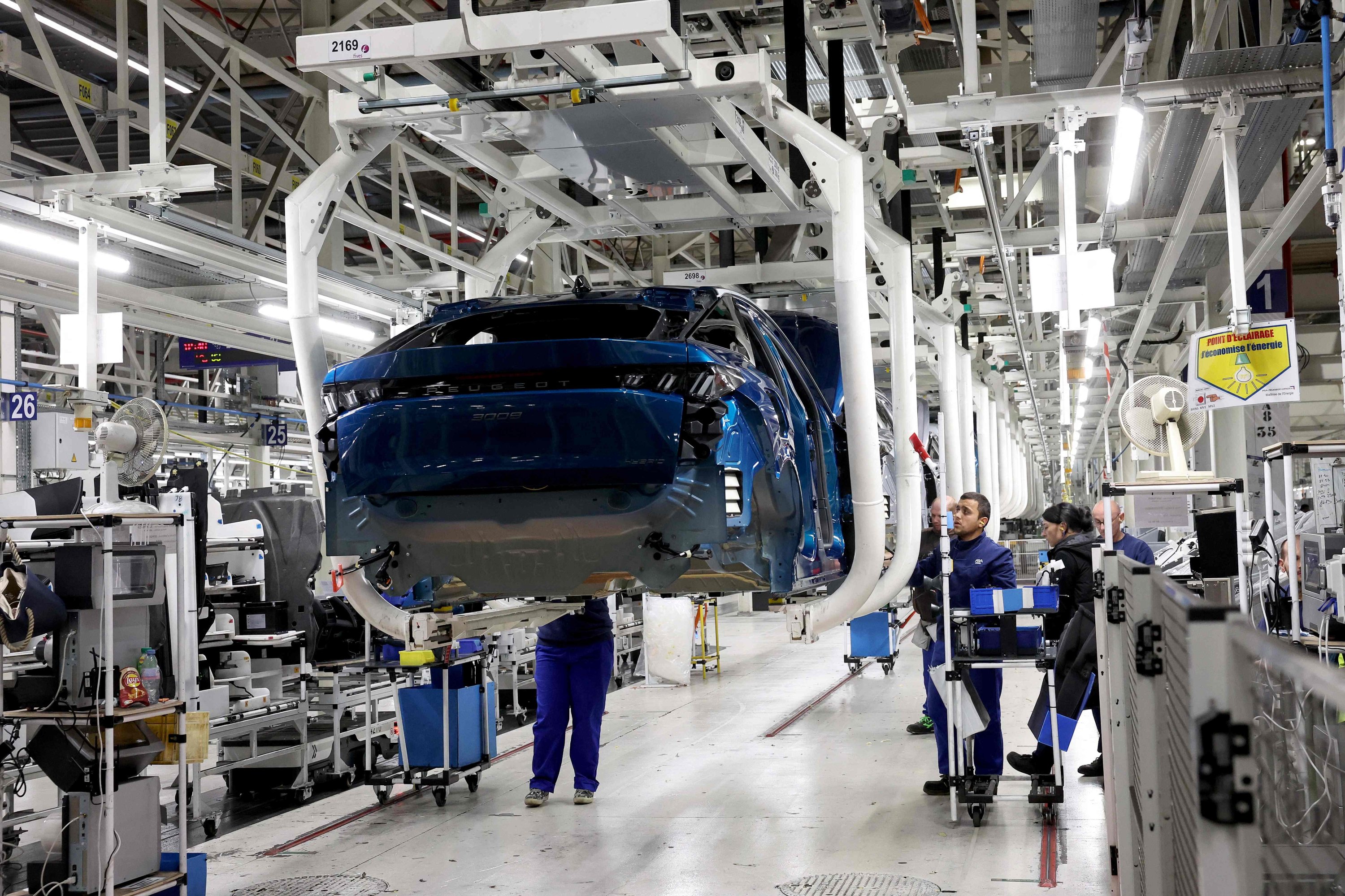 Employees are at work on the production line of the new Peugeot e-3008 and e-5008 electric car at the Stellantis factory, Sochaux, France, Oct. 3, 2024. (AFP Photo)
