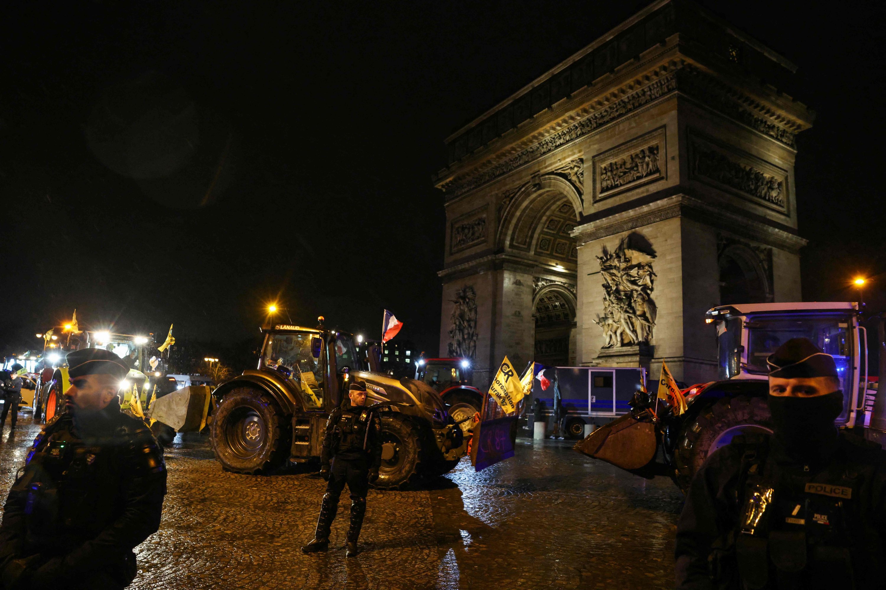 The farmers overran police checkpoints to enter the city, driving along the Champs Elysees avenue and blocking the road around the Arc de Triomphe before dawn, before gathering in front of the National Assembly.