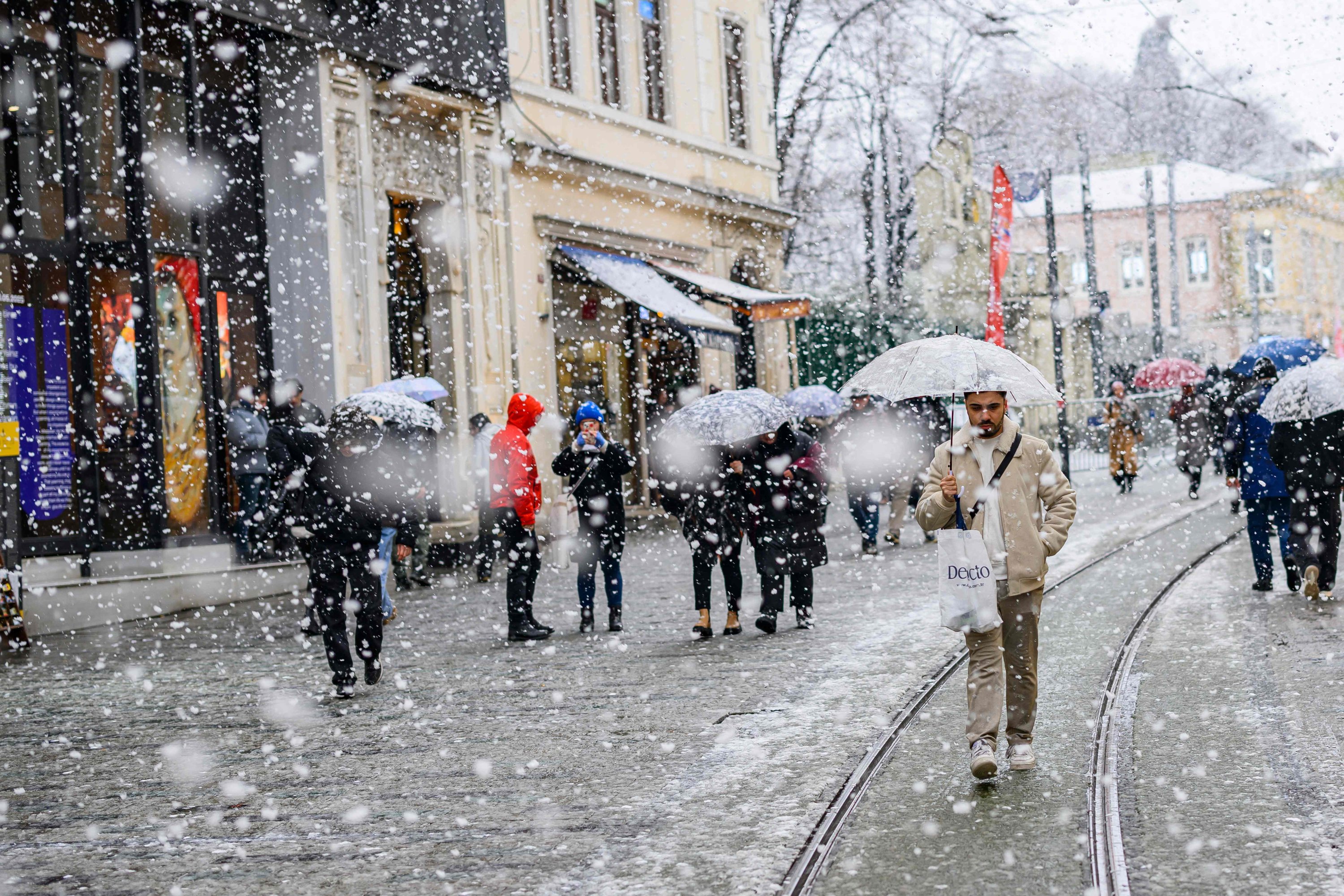 People walk along Istiklal Street as snow falls, Istanbul, Türkiye, Feb. 19, 2025. (AFP Photo)