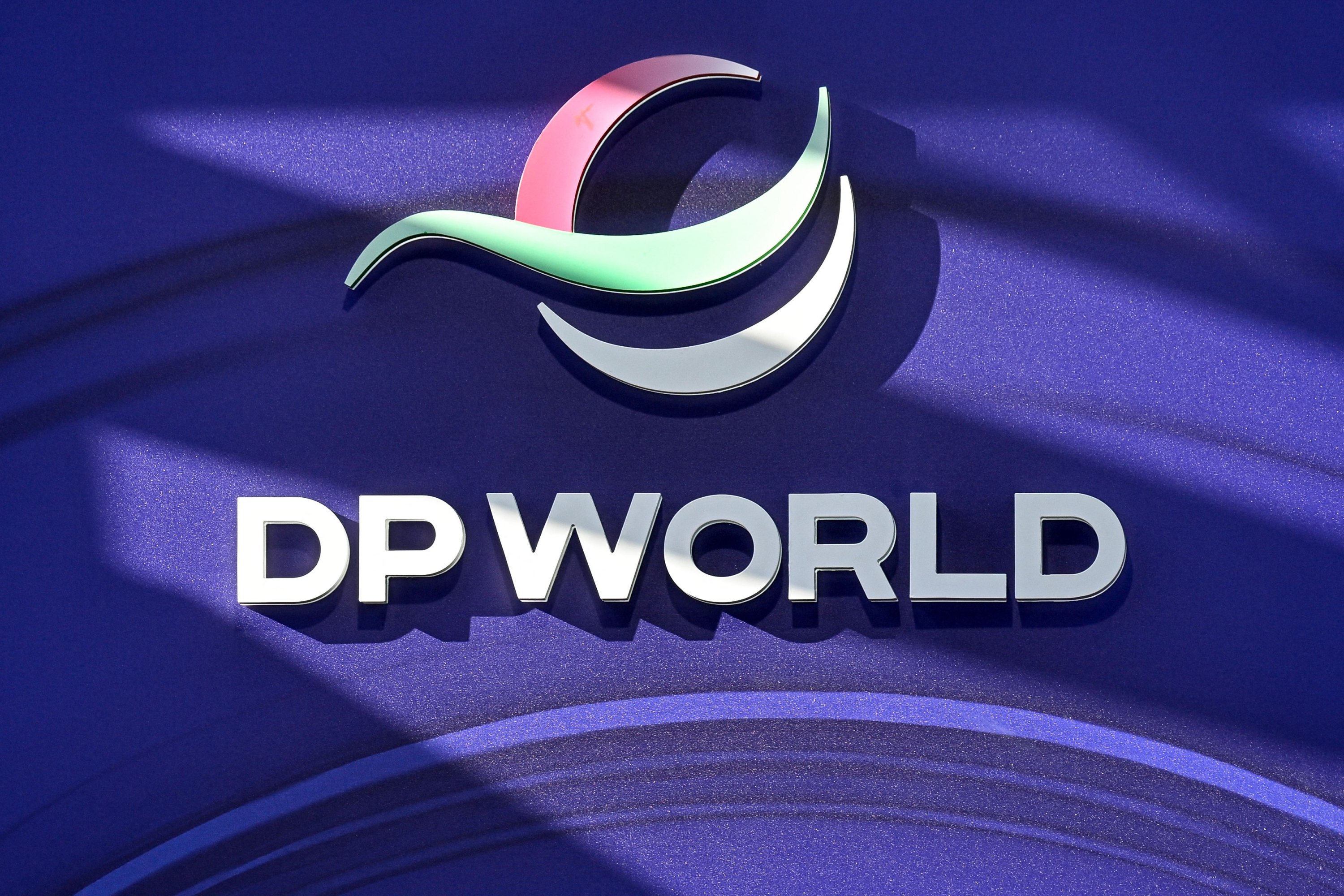 The logo of the multinational logistics company DP World is seen in the Alpine resort of Davos during the World Economic Forum (WEF) annual meeting, Switzerland, Jan. 20, 2026. (AFP Photo)