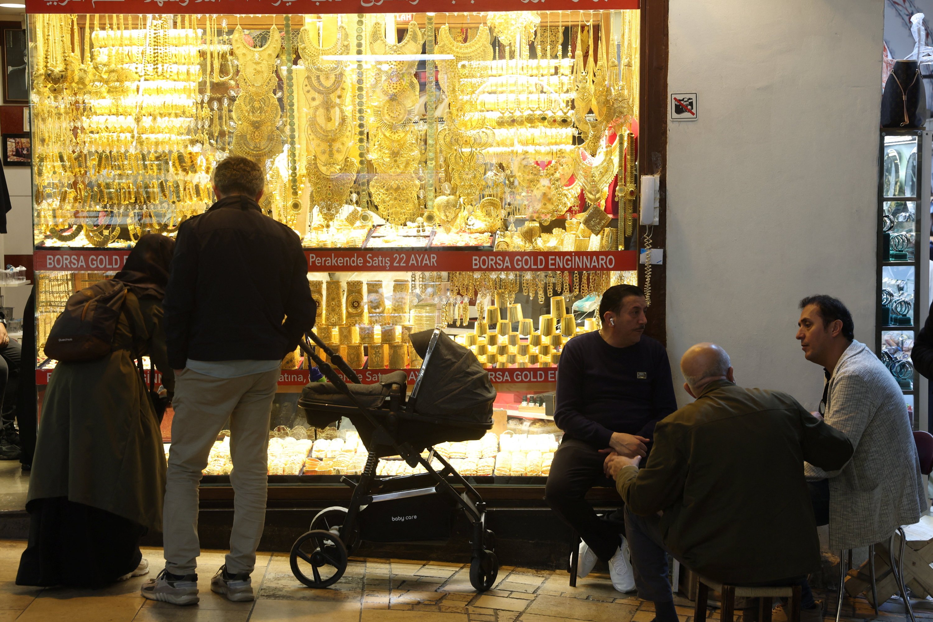 People look at gold jewellery as they stand outside a shop at the Grand Bazaar in Istanbul, Türkiye, Oct. 17, 2025. (Reuters Photo)