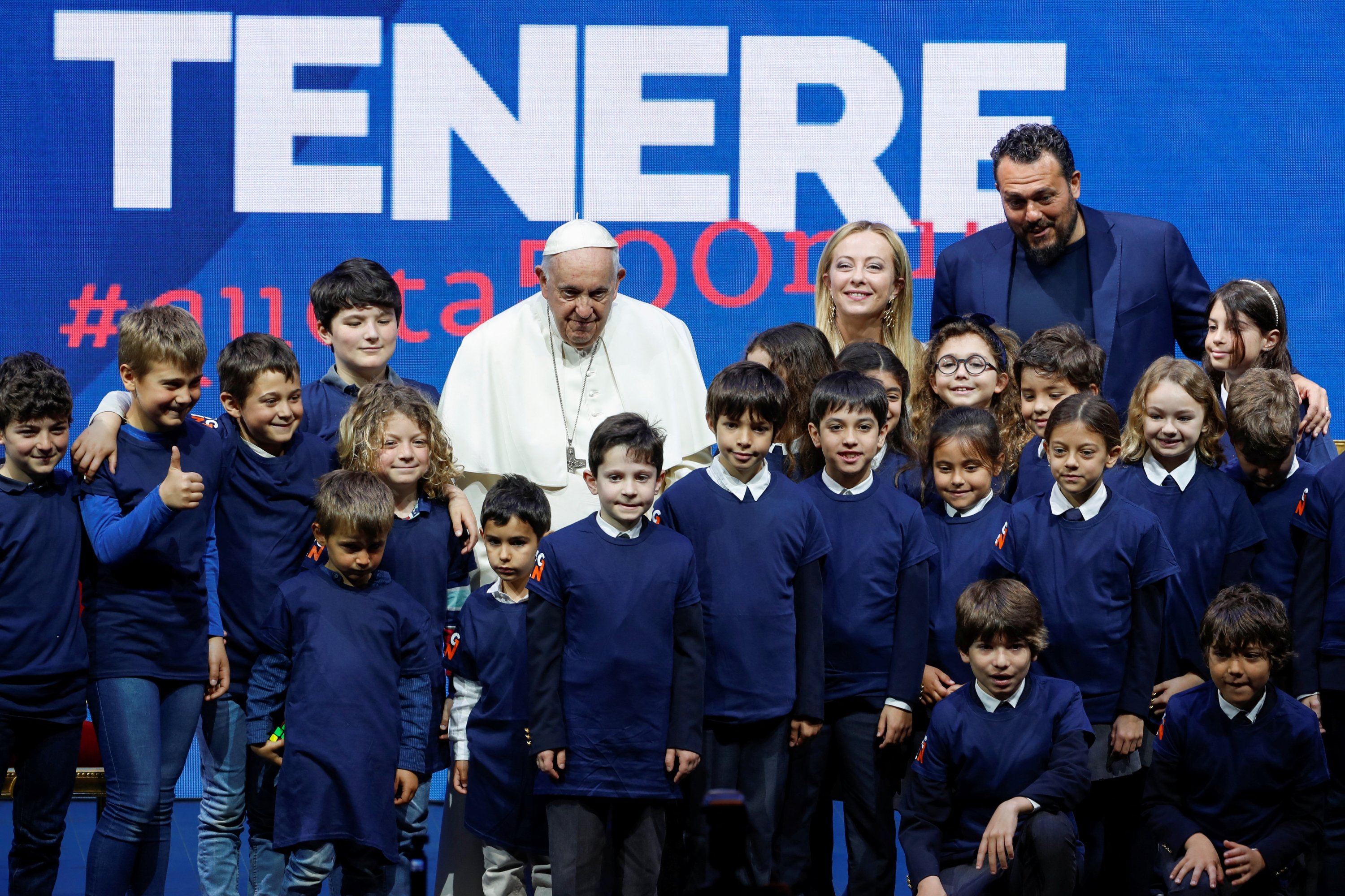 Pope Francis and Italy's Prime Minister Giorgia Meloni pose with children at a national confront on demographics in Rome, Italy, May 12, 2023. (Reuters Photo)
