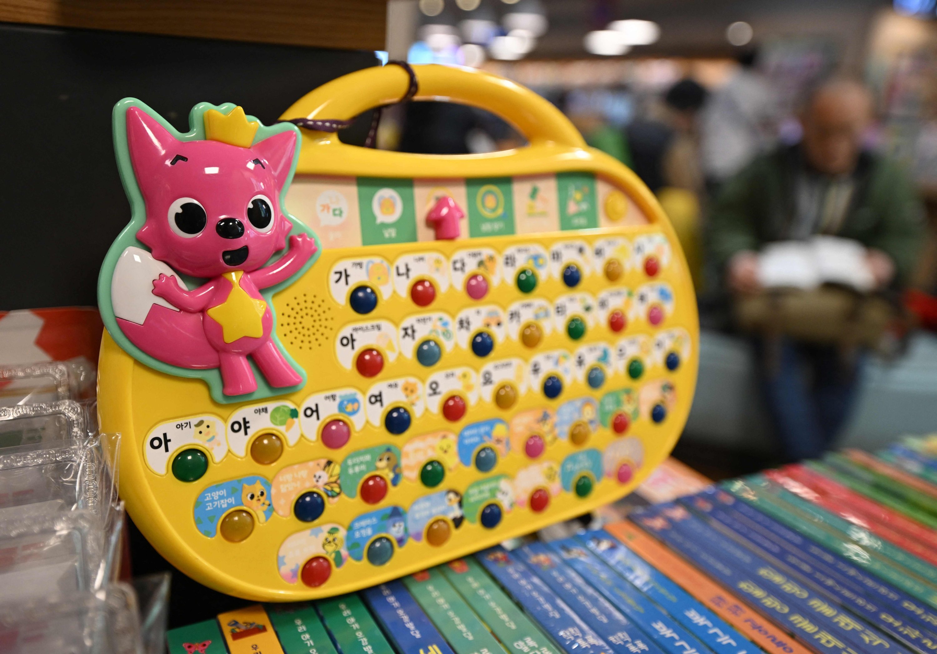 A Pinkfong sound book alphabet bag is displayed at a bookstore, Seoul, South Korea, Nov. 18, 2025. (AFP Photo)