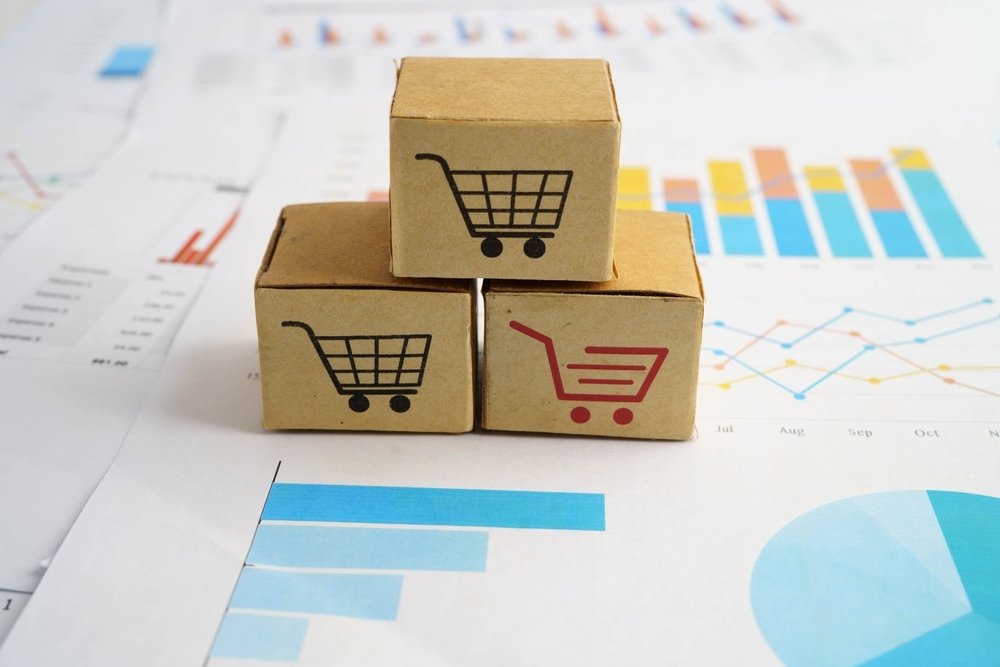 Shopping cart box representation over a business graph. (Shutterstock Photo)