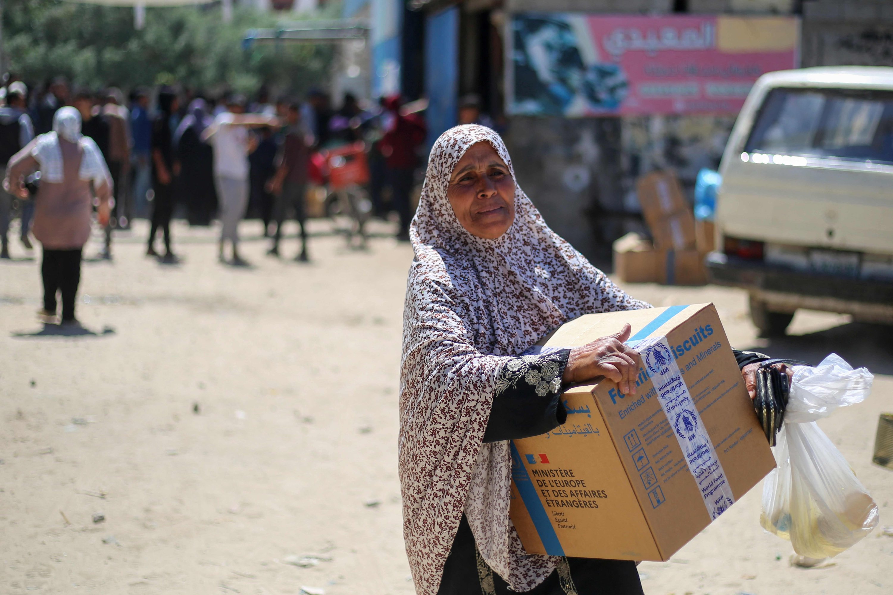 Palestinians receive food packages from a distribution center for the United Nations' World Food Programme (WFP) at the Nuseirat refugee camp in the central Gaza Strip, Palestine, April 26, 2025. (AFP Photo)