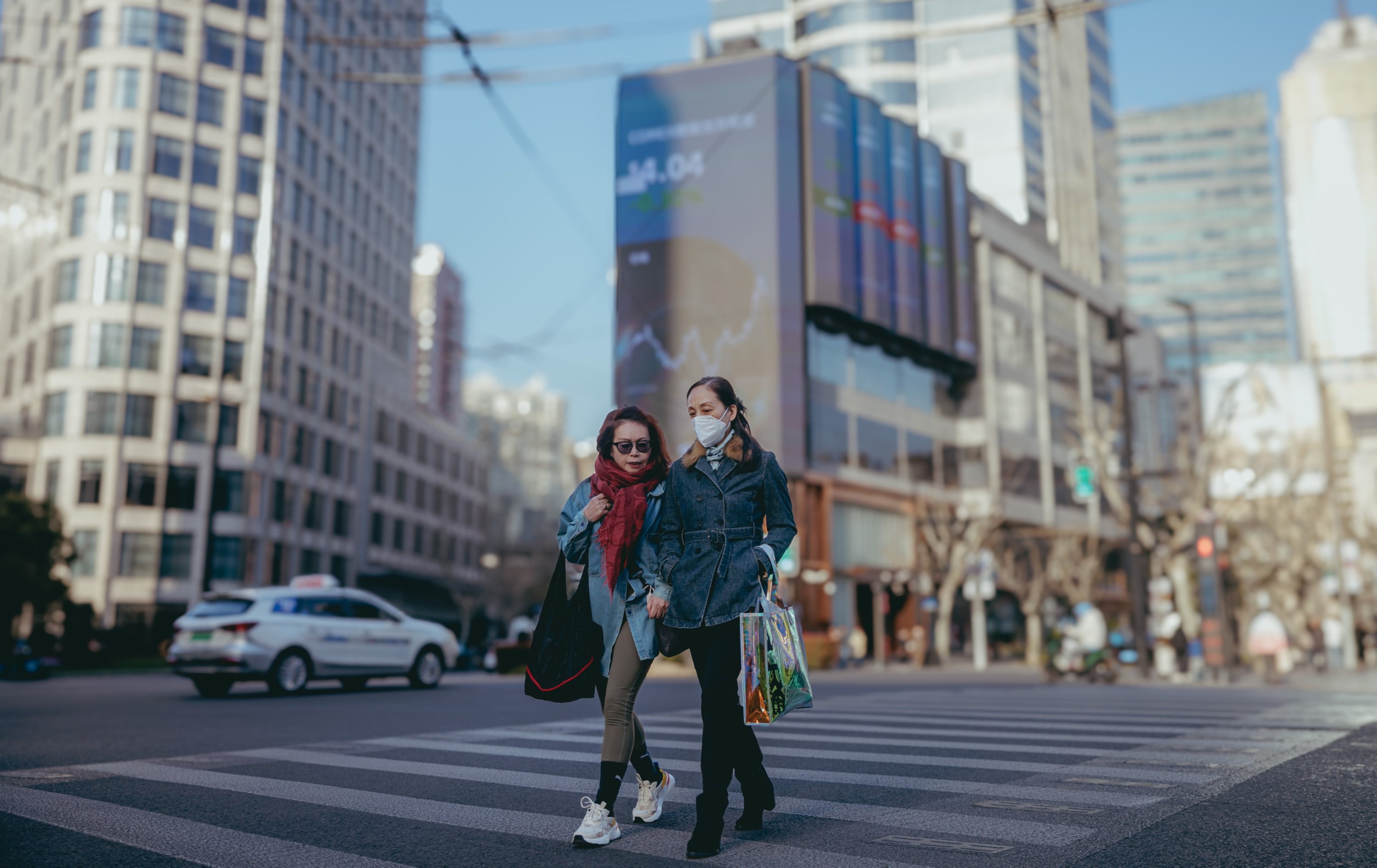People cross the street near a large screen showing the latest economy and stock exchange data in Shanghai, China, March 20, 2024. (EPA Photo)