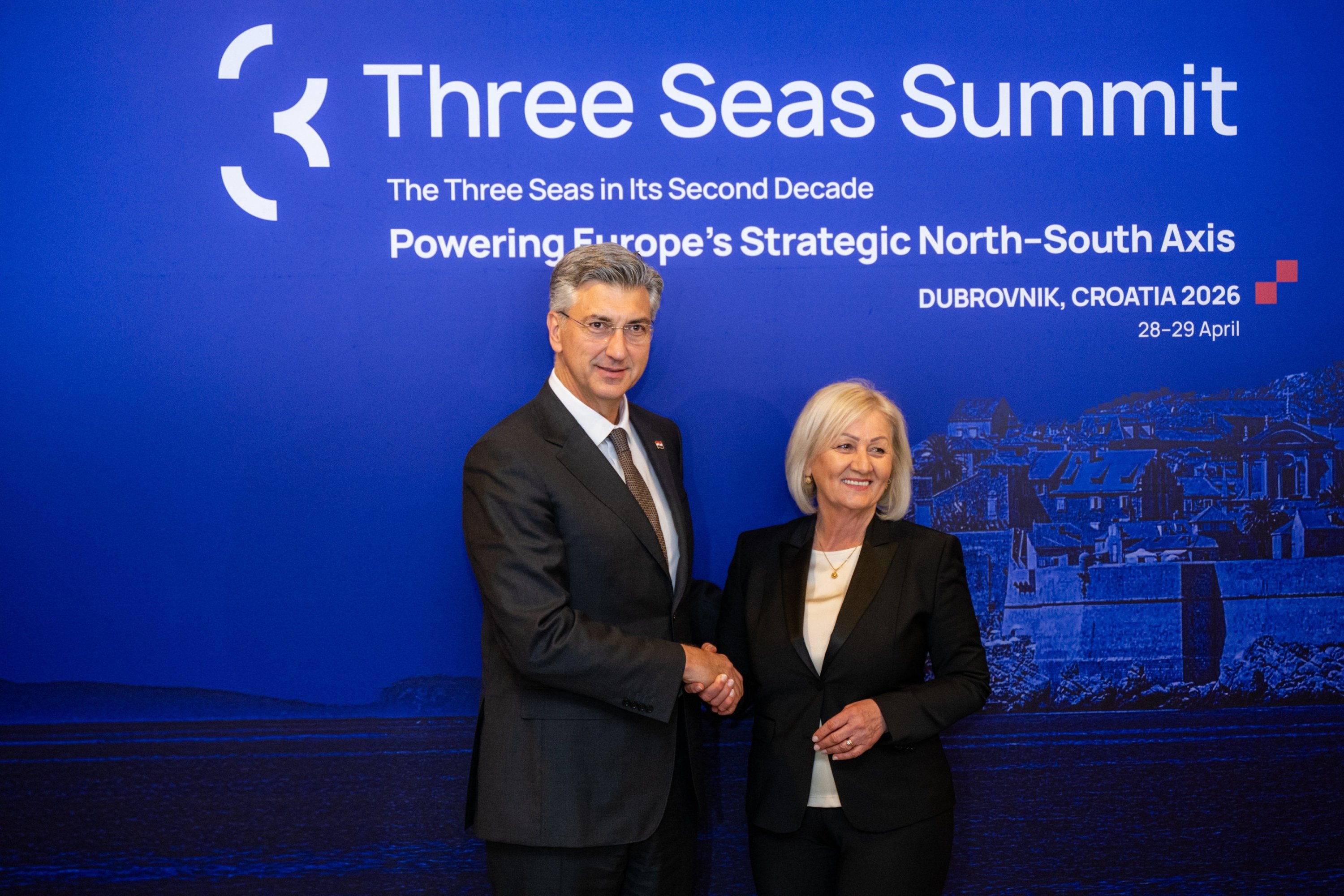 Croatia's Prime Minister Andrej Plenkovic shaking hands with Chairwoman of the Council of Ministers of Bosnia-Herzegovina Borjana Kristo ahead of the Three Seas Summit in Dubrovnik, Croatia, April 28, 2026. (EPA via Croatian Foreign Ministry Handout)