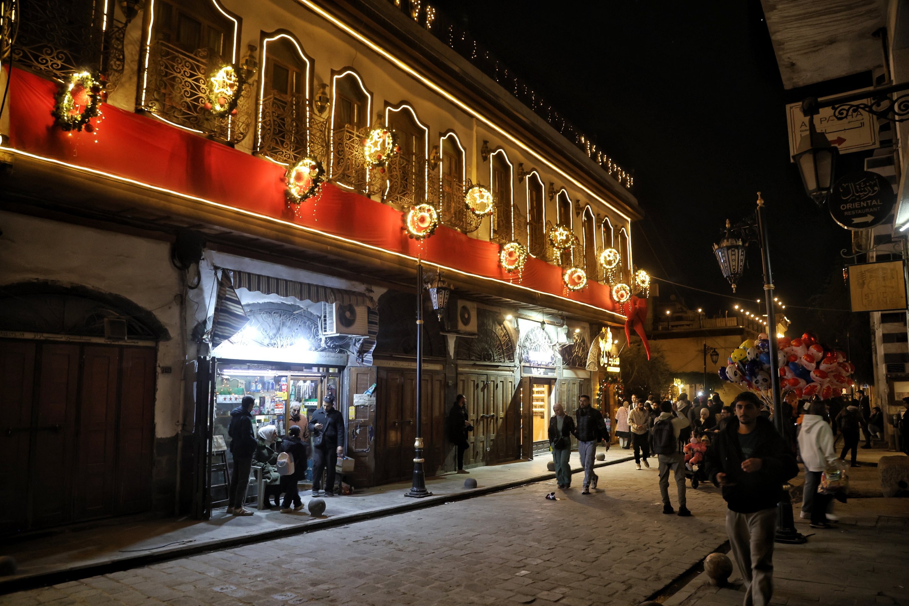 Crowds gather in a street decorated with lights during New Year's celebrations, Damascus, Syria, Dec. 31, 2025. (EPA Photo)