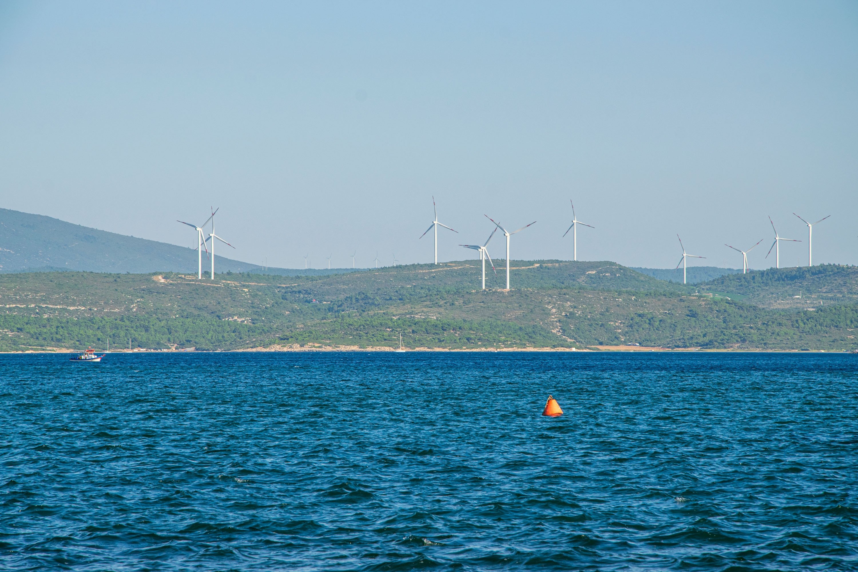 Wind turbines are seen in Sığacık, a seaside neighborhood of Seferihisar district in the western province of Izmir, Türkiye, Dec. 14, 2020. (Shutterstock Photo)