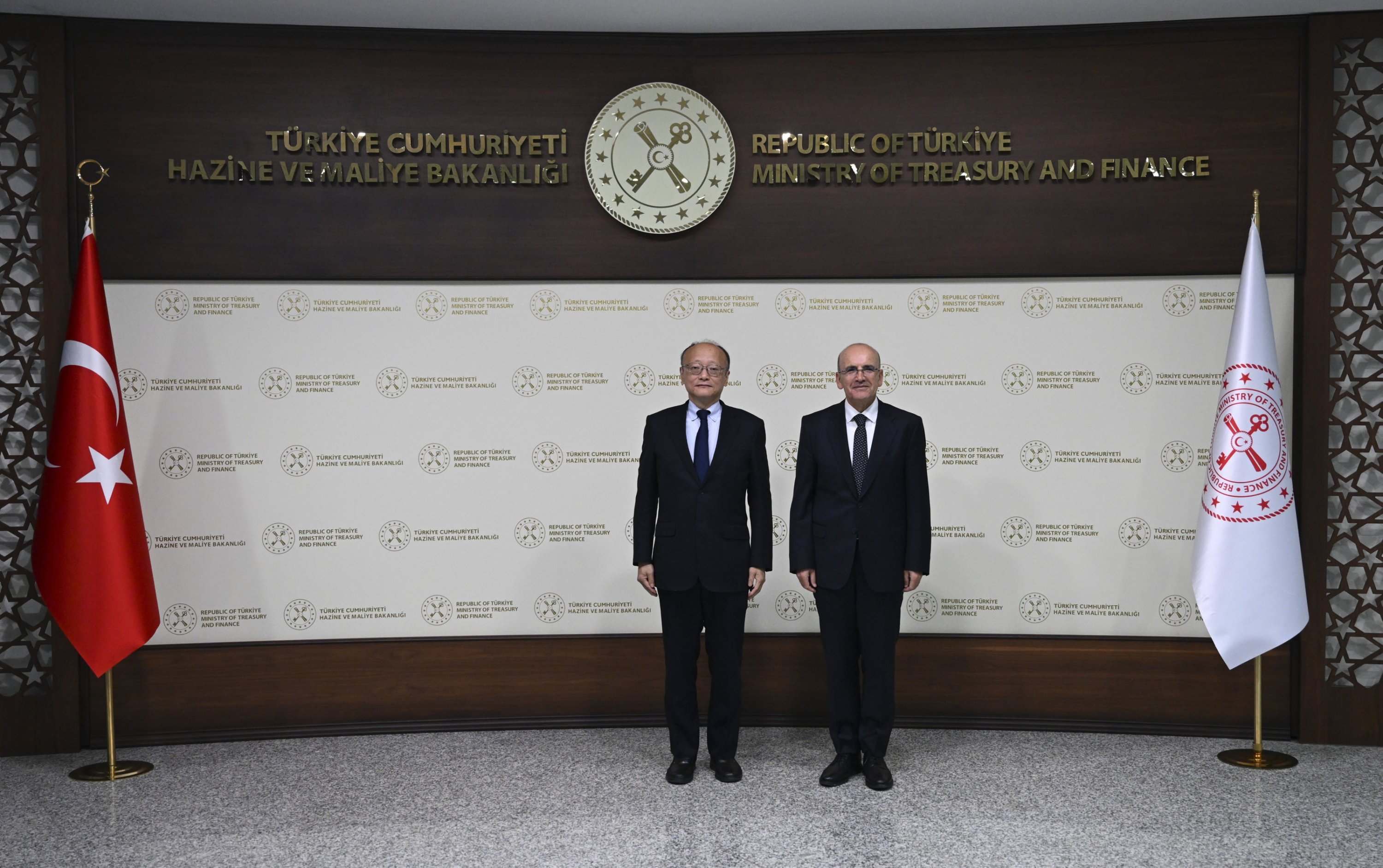 Treasury and Finance Minister Mehmet Şimşek (R) poses alongside Asian Development Bank President Masato Kanda at the Treasury and Finance Ministry headquarters, Ankara, Türkiye, Nov. 12, 2025. (AA Photo)