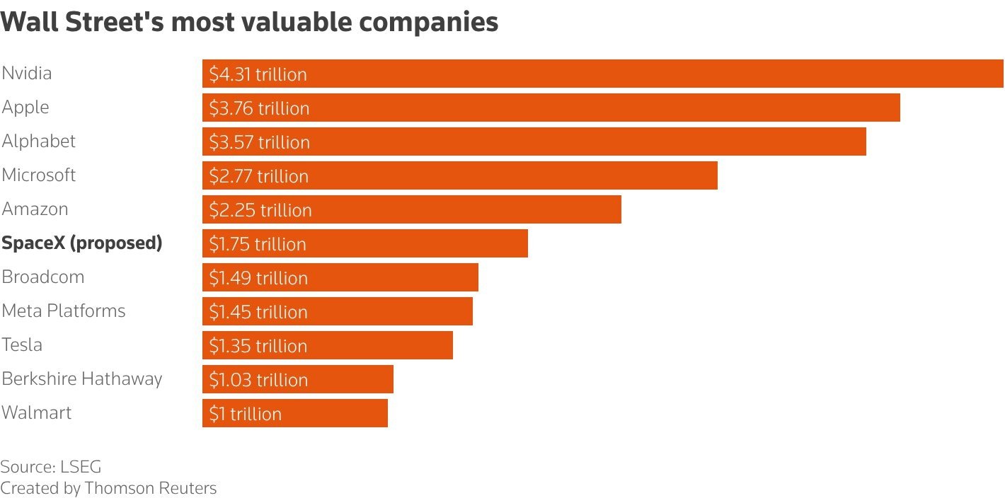 Elon Musk’s SpaceX is reportedly targeting a valuation of around $1.75 trillion in its forthcoming initial public offering (IPO), which would push it right at the top of the world's most valuable companies. But how far into the stratosphere is that?