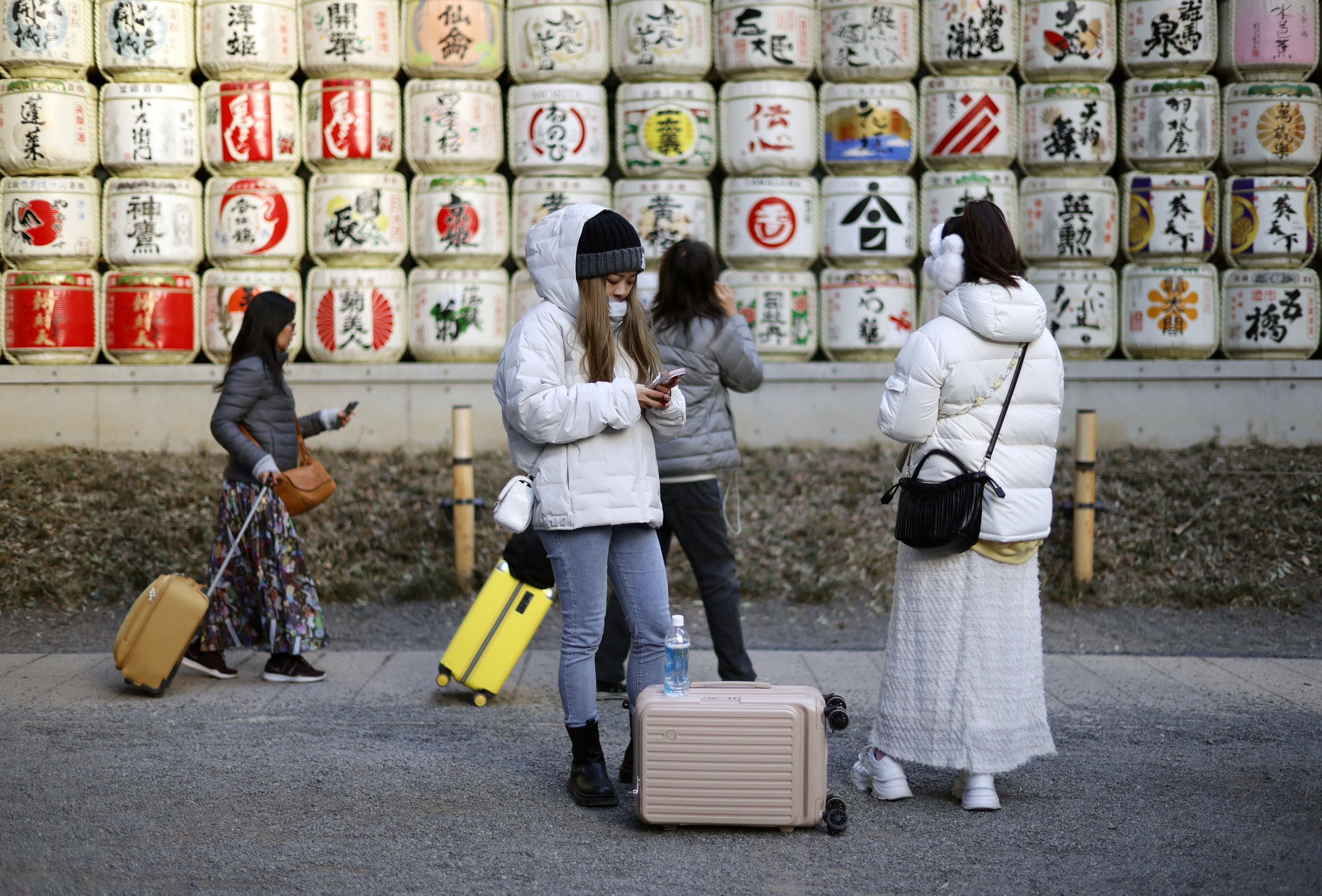 Tourists stroll past sake barrels displayed at the Meiji Jingu shrine, Tokyo, Japan, Jan. 21, 2026. (EPA Photo)