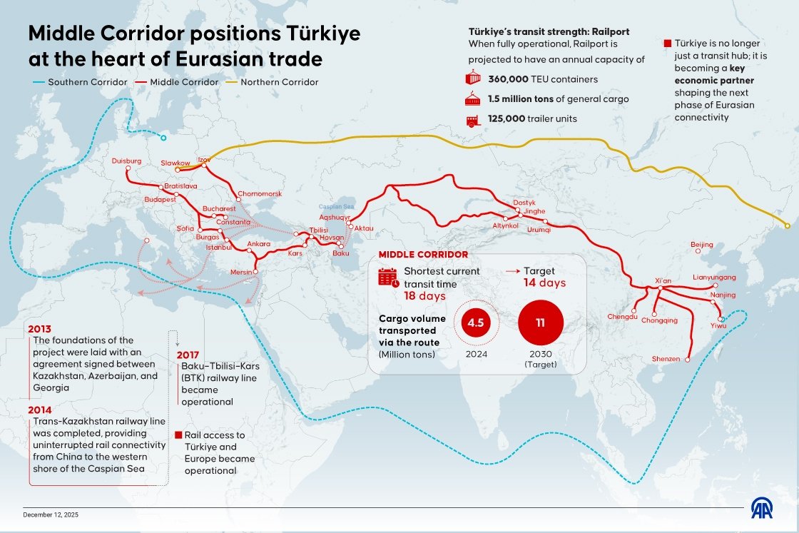 As global supply chains shift from Russia-dependent routes and congested maritime points, the Middle Corridor – stretching from China to Europe via Central Asia and Türkiye – is emerging as a major Eurasian trade link, strengthening Türkiye’s role as a central hub connecting East and West.