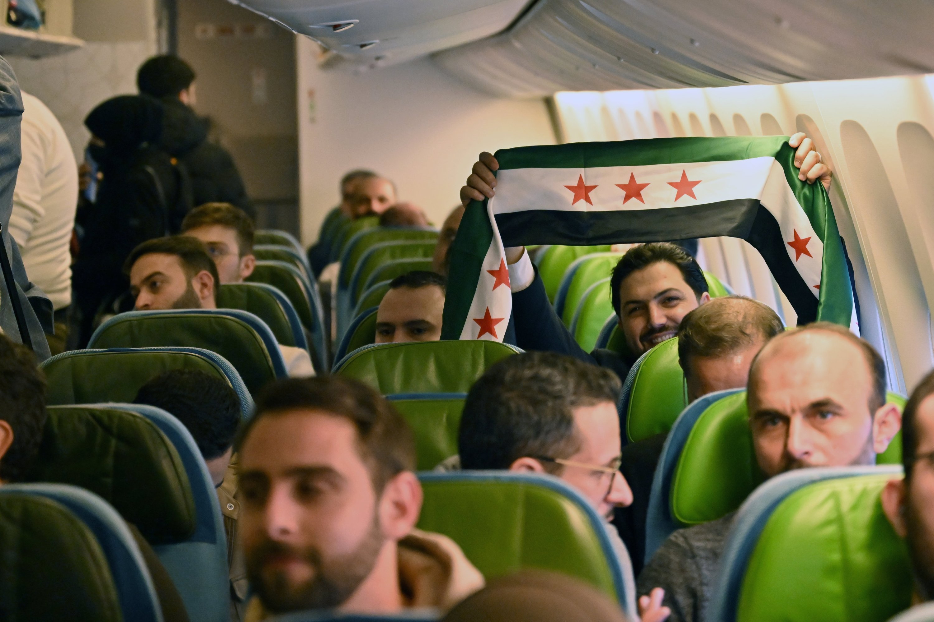 Many Syrians who were due to fly to their homeland were spotted at the airport carrying flags and celebrating with songs, a report by Demirören News Agency (DHA) said.