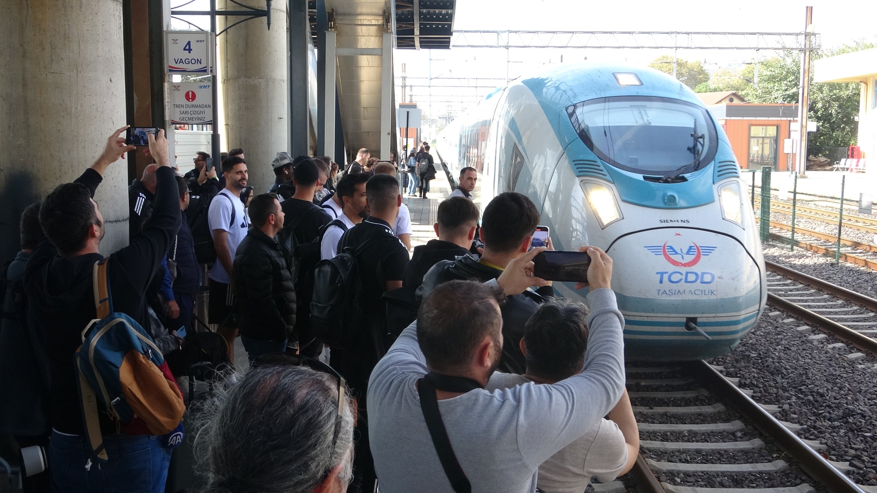 People take a photo of a high-speed train (YHT) carrying football players, Kocaeli, northwestern Türkiye, Oct. 17, 2025. (DHA Photo)