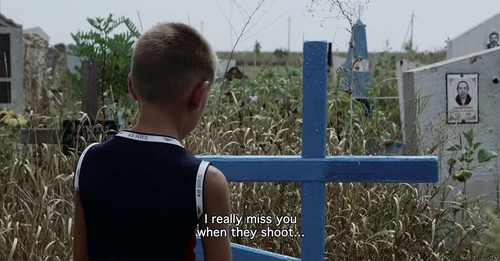 Like Alyosha in "Loveless," Oleg has formed a relationship with his immediate natural surroundings. We see him walk through the tall grass and enjoy swimming in the lake while counting the shell and mortar exchanges between the Russian and Ukrainian armies. He has, unfortunately, also formed a bond with his unnatural surroundings - abandoned factories and silos where he practices shooting with an older boy who likes to show off.