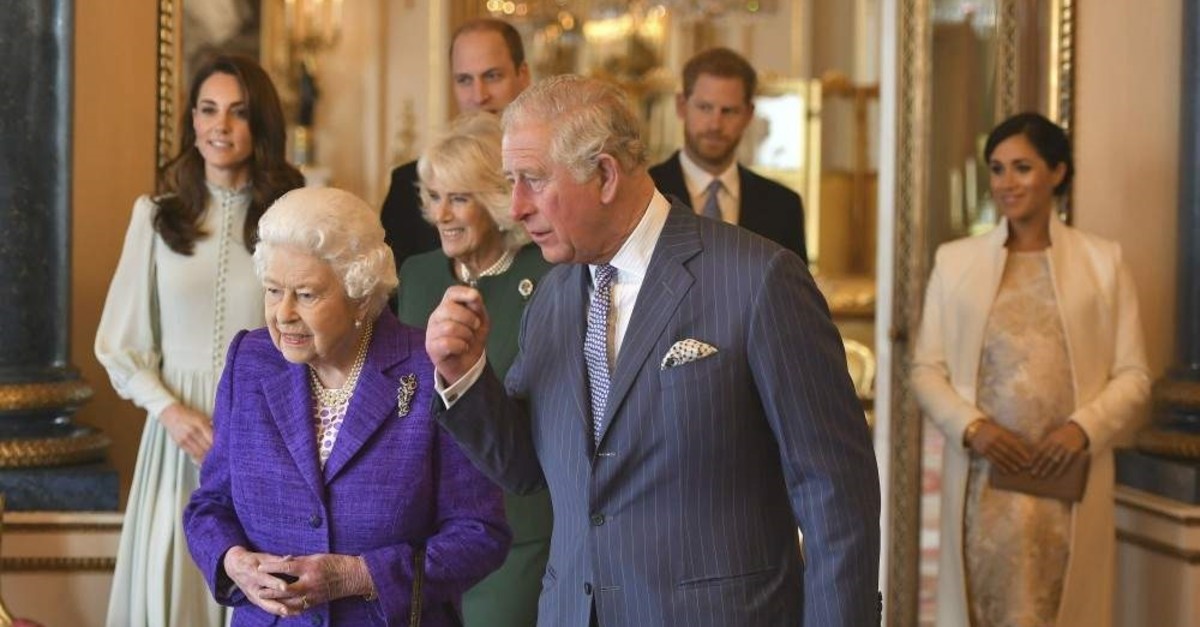 Britain's Queen Elizabeth II is joined by Prince Charles and at rear, from left, Kate, Duchess of Cambridge, Camilla, Duchess of Cornwall, Prince William, Prince Harry and Meghan, Duchess of Sussex, during a reception at Buckingham Palace, March 5, 2019. (AP Photo)