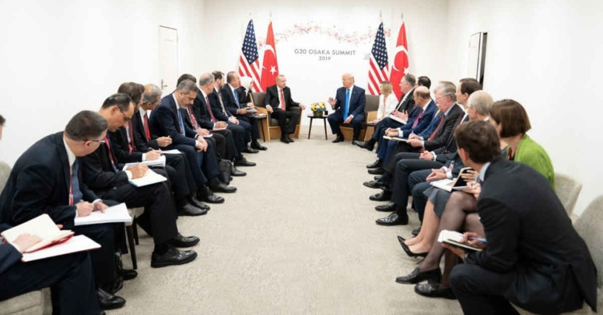 President Recep Tayyip Erdou011fan and U.S. President Donald Trump and their delegations during a meeting on bilateral relations at the G20 summit, Osaka, Japan, June 29, 2019.