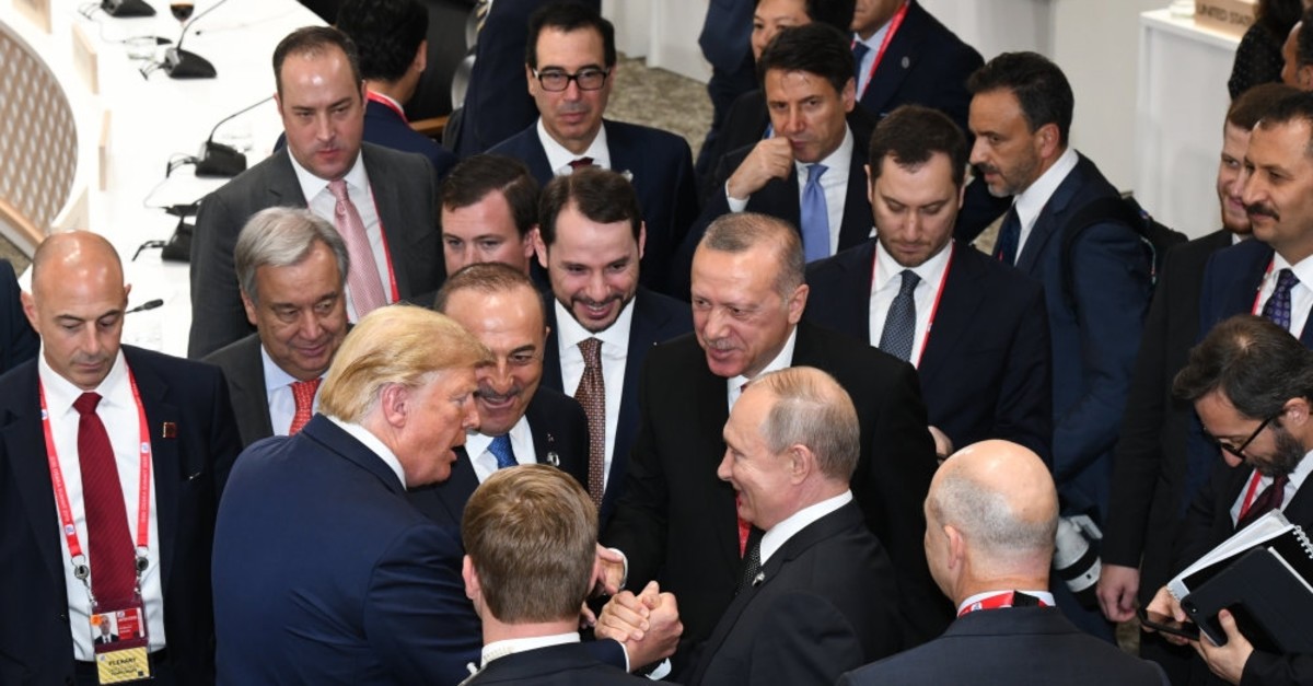 President Recep Tayyip Erdou011fan (C), U.S. President Donald Trump (L) and Russian President Vladimir Putin (R) have a quick talk during the G20 summit of world leaders in Osaka, Japan, June 30, 2019.
