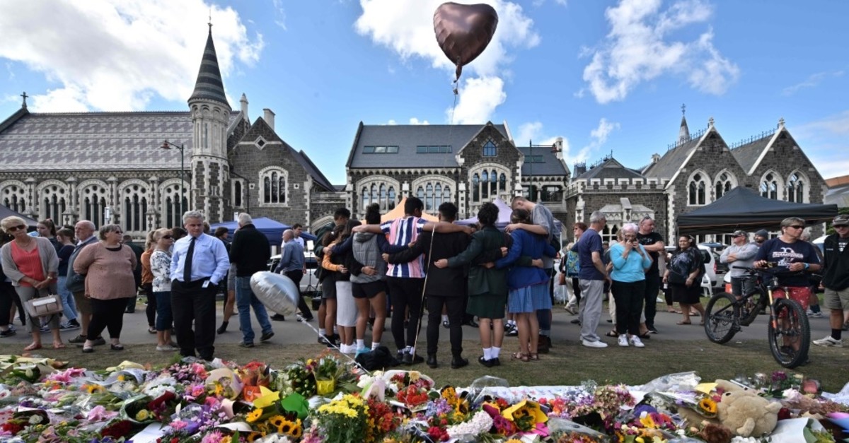 A group of students (C) sings in front of flowers left in tribute to victims at the Botanical Gardens in Christchurch on March 19, 2019, four days after a terrorist attack at two mosques that claimed the lives of 50 people.