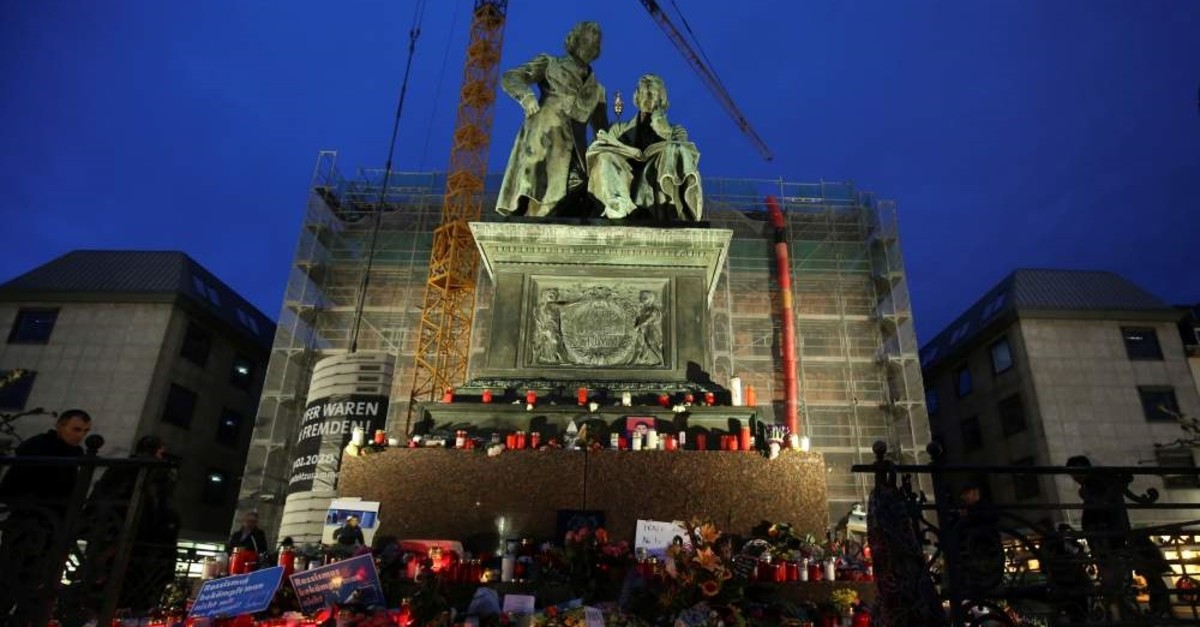 Candles and flowers are placed at the Brothers Grimm monument for the victims of the recent shooting in Hanau, near Frankfurt, Germany, Feb. 22, 2020. (REUTERS Photo)